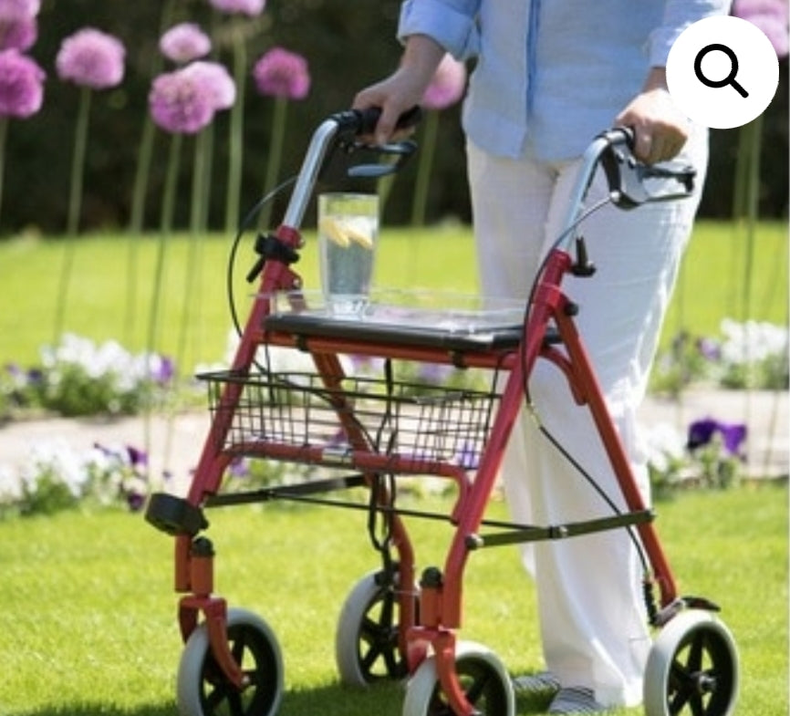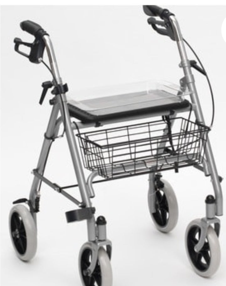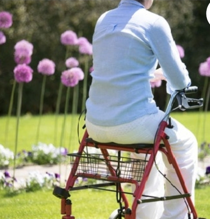 The SR8 Steel Rollator is a robust, yet lightweight rollator that provides the user with balance and support while maintaining a fluent style of walking. Suitable for indoor and outdoor use with large wheels, sturdy tyres and front swivelling wheels, ensuring excellent manoeuvrability. Handle height adjusts tool free to meet user requirements. The handles provide comfortable grip and the arthritic friendly cable are easily enabled and locked for stability. Padded polyurethane seat offers comfort and support when seating is required. A storage basket and tray are provided, as is a walking stick holder. Simple folding mechanism enables storage space and ease of transportation. Available in Silver.